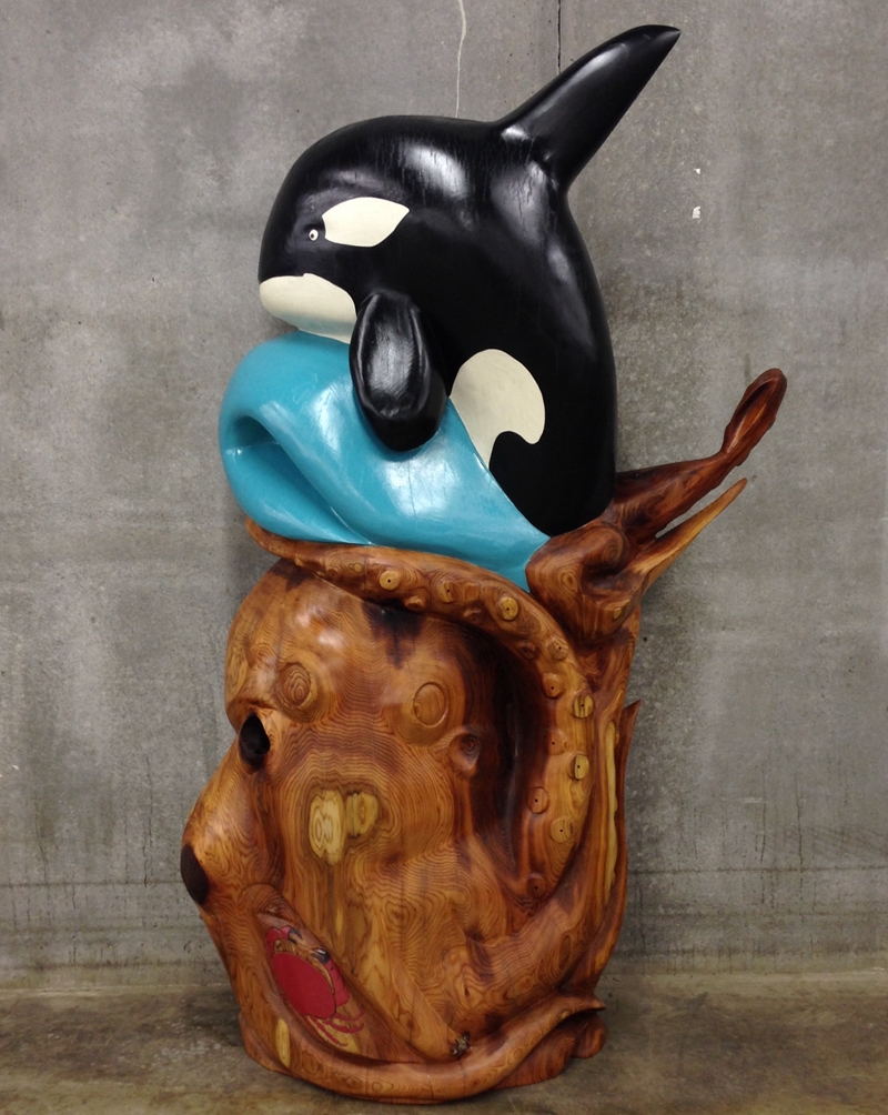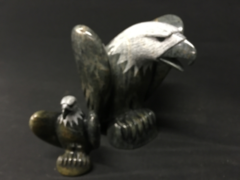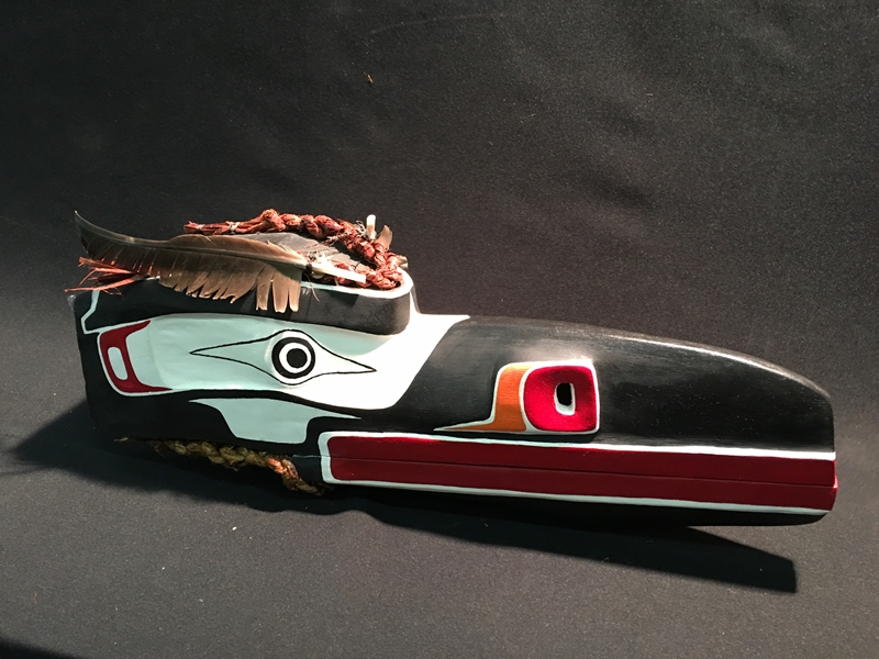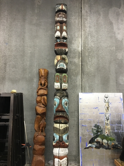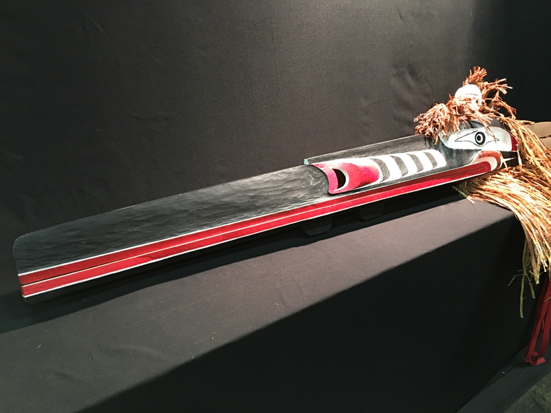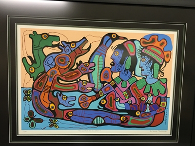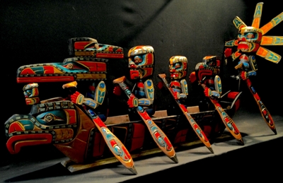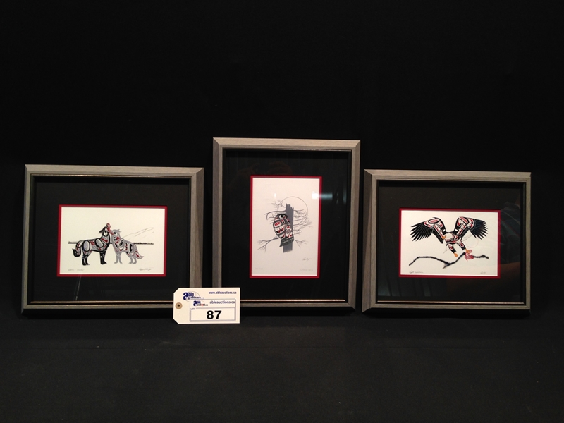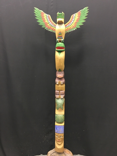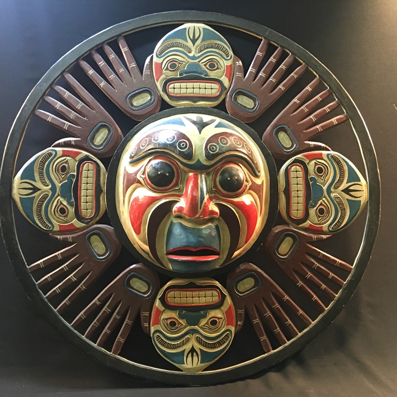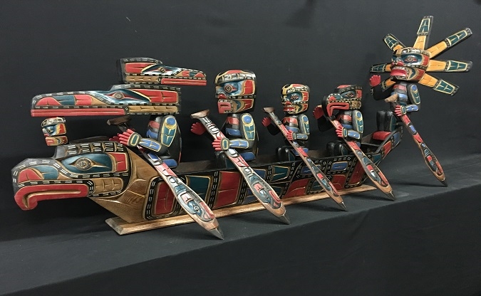 3 Beau Dick masks, these masks were recently danced and featured in an Alert Bay Potlatch, Stan Hunt masks, 10 other items from members of the legendary Hunt Family, Artist signed limited edition prints by Norval Morrisseau, Gene and Jay Brabant masks, Tom Patterson carved totem pole, 6 carvings by Alert Bay's Jimmy Joseph including a stunning 7' sun mask and 5' long carved canoe with paddling figures, a dramatic Corey Larocque 4' Duzakawa, 2 beautiful intricate masks carved by Stan Greene, 3 masks by Terry Jackson. Other masks carved by: Randy Stiglitz, Ryan Morin, Janice Morin, Emil Thibert, Andy Wesley, Darren Yelton, Daryl Francis, a spectacular 8' tall carved totem by George Price depicting a killer whale and Octopus (carved from a single piece of wood), dozens of carved wall hangings, argillite totems and carvings.